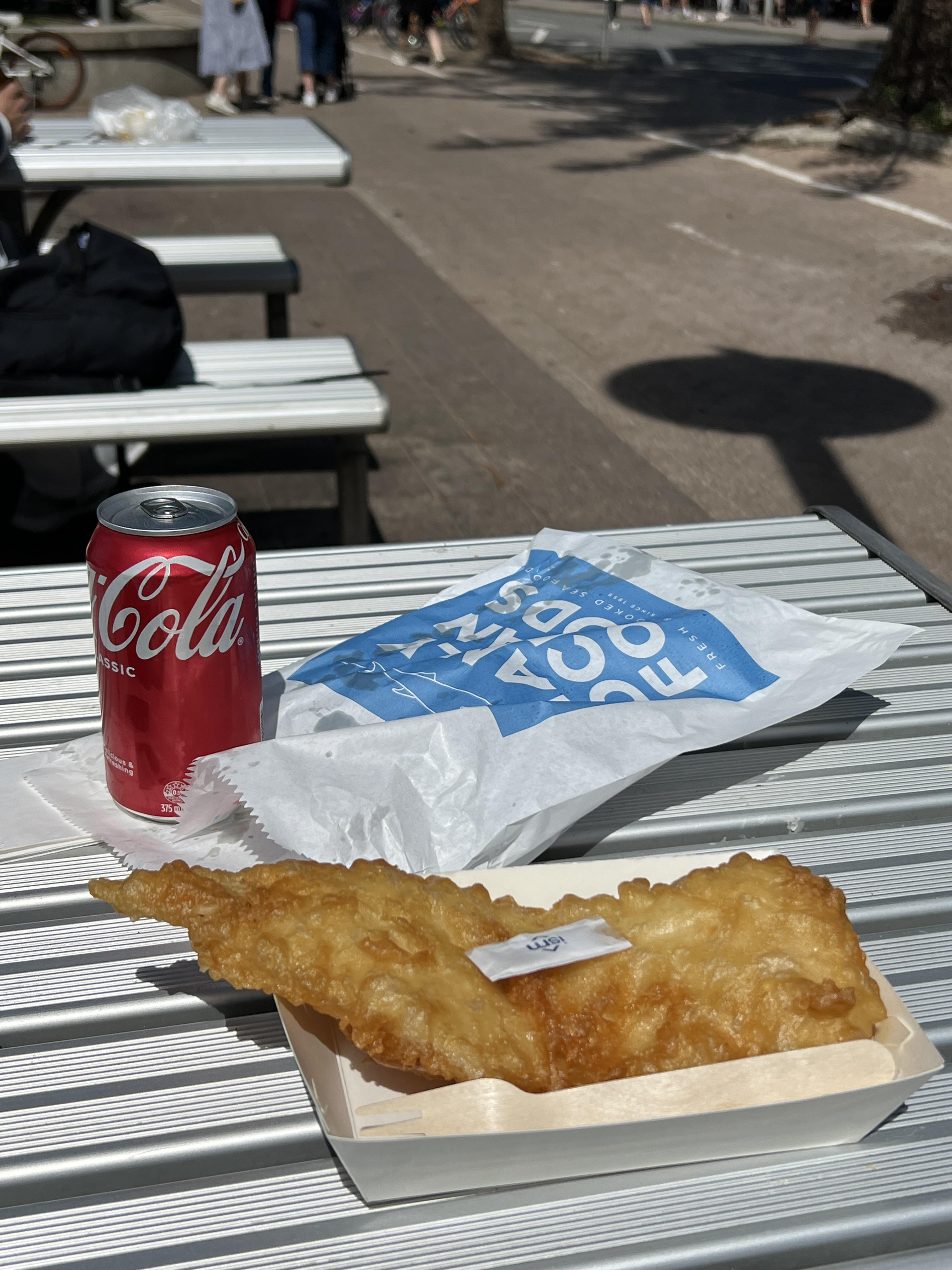 맨리 오션 푸드라는 피쉬앤칩스 가게에서 테이크아웃을 했다. 나는 햄버거 세트도 감자튀김 없이 먹는걸 좋아하는데, 여기서도 칩스를 빼고 피쉬 온리로 주문이 가능했다. 1번 피쉬앤칩스에서 피쉬온리로 12달러에 구매했다. 약 만원 정도. 맥주가 땡겼으나 오후에 브릿지 클라임을 위해 콜라를 곁들였다.