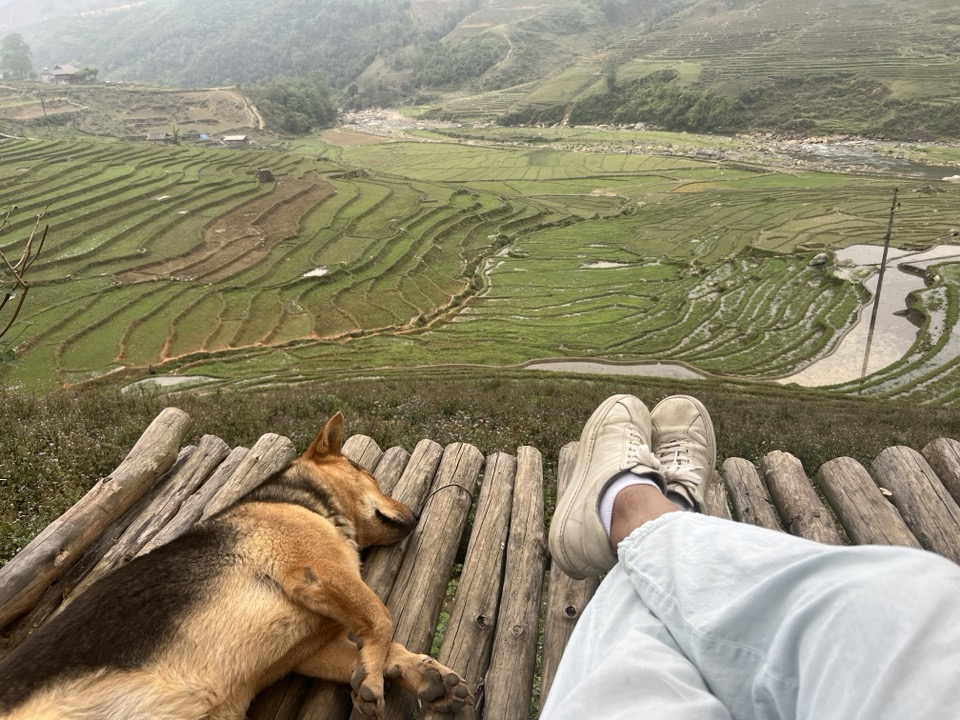 이 뷰를 보며 쉬고 있었는데 한번은 강아지가 옆에 와서 잠을 잤고, 한 번은 고양이가 와서 애교를 부렸다. 논을 바라보면 농부 선생님이 논을 갈고 있고 검은 소들이 풀을 먹고 있었다. 평화로웠다. 2주 간의 베트남 여행에서 가장 기억에 남는 카페를 고르라고 한다면 주저 없이 세일링 사파를 선택하겠다.