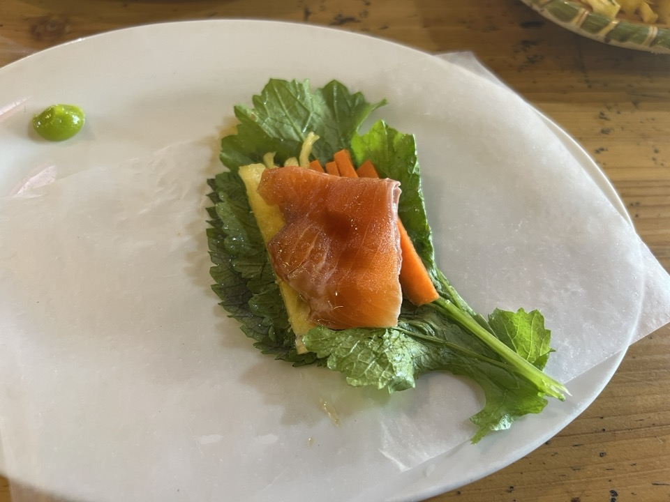 먹는 법은 간단하다. 라이스 페이퍼에 채소, 파인애플, 당근, 연어를 넣고 간장을 찍어서 먹으면 된다. 고수를 잘 못 먹는데, 조금 넣어 먹었더니 맛이 괜찮았다.